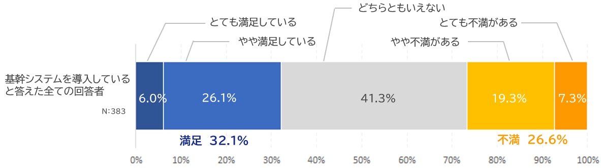 業務のムリ・ムダ・ムラの大きな原因となっているのが基幹システムです。弊社が2022年9月に実施した「基幹システム利用実態調査 2022」で、現在利用している基幹システムの満足度を質問したところ、「満足」と答えている企業の割合は32.1%に留まりました(※図1)。