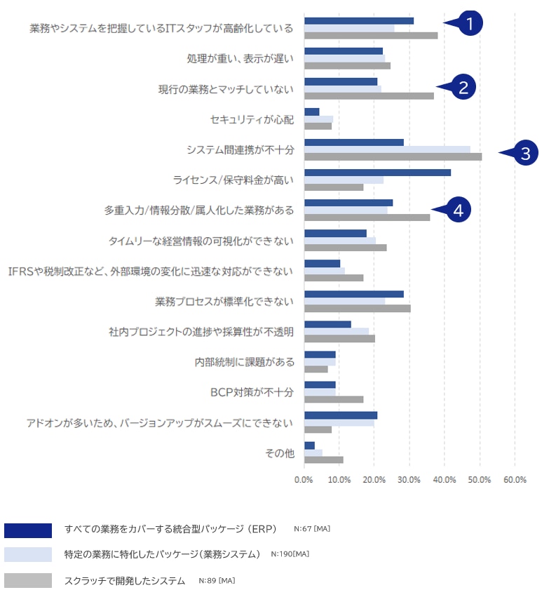 スクラッチのシステムはパッケージと異なり、その企業の業務プロセスが円滑に運用されるよう設計しているはずです。それにもかかわらず満足度が最も低いという結果は、スクラッチ開発が業務に合わせているために業務の最適化を阻害していることを示唆しています。